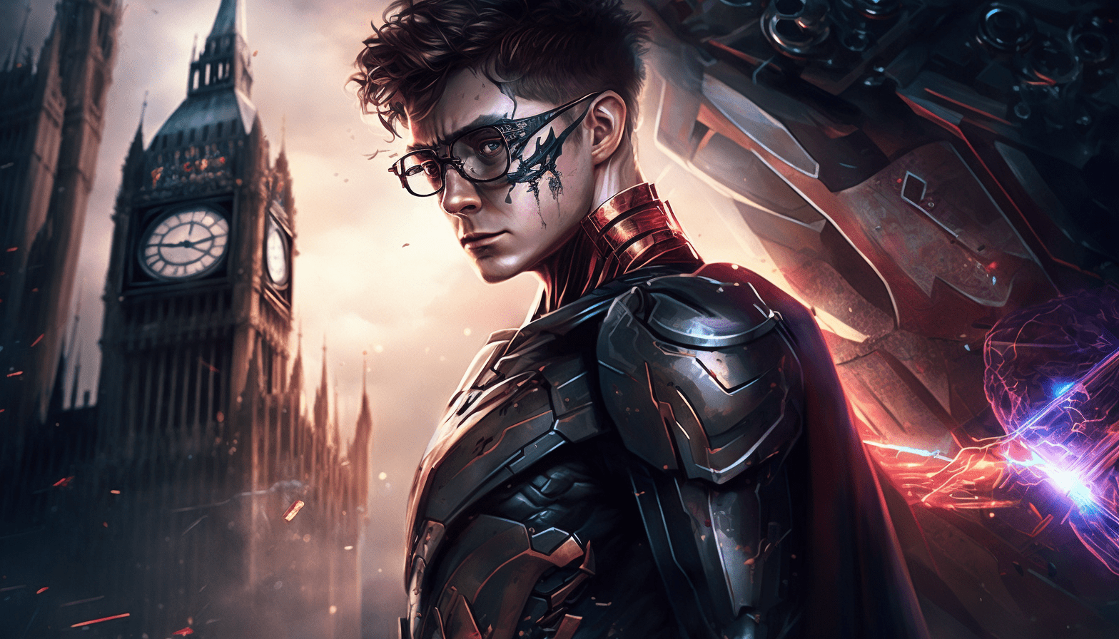 /image cyborg harry potter in London 2045 with space ship in background Cinematic lighting, hyper maximalist, elegant, hyper realistic, wallpaper, super detailed 8K photorealistic --q 5 --ar 16:9